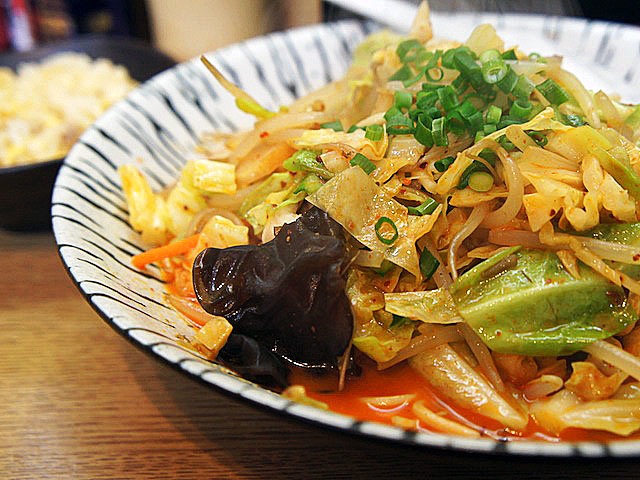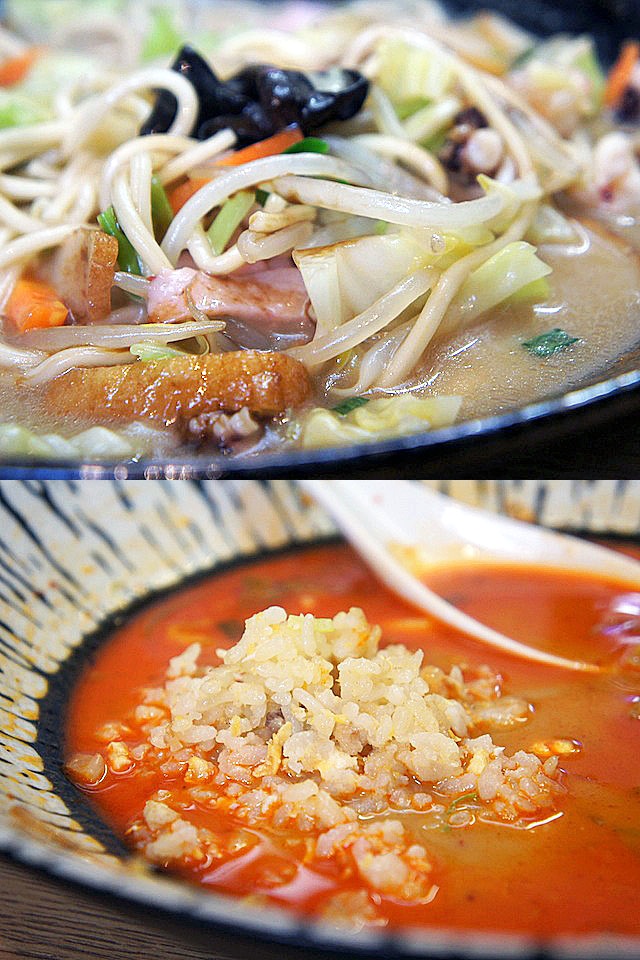 辛味チャンポンの麺と具材をキレイに食べて残ったスープにセットでたのんだミニチャーハンを、ポンッと放りこみスープと一緒にすくって食べる。