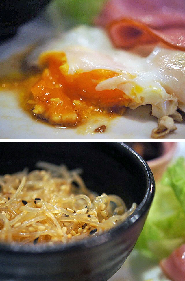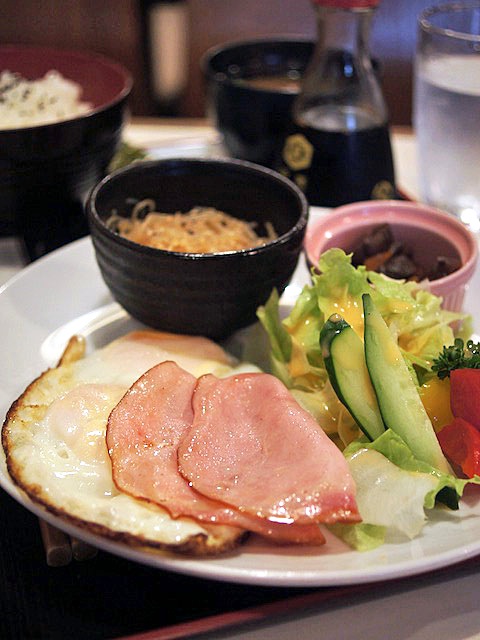 キューリにレタス、それから軽く酢漬けにしたパプリカと色とりどりのサラダを頭に、玉子が2個の目玉焼き。