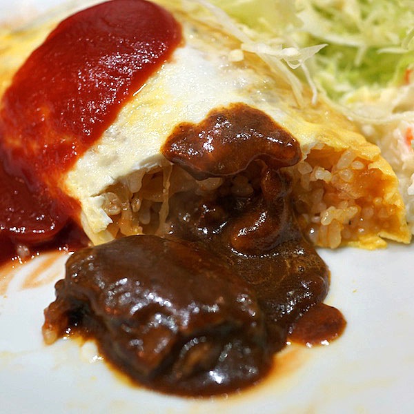 シチューのソースをオムライスにかり、赤のソースと黒のソースの饗宴たのしむ…、「赤と黒」。