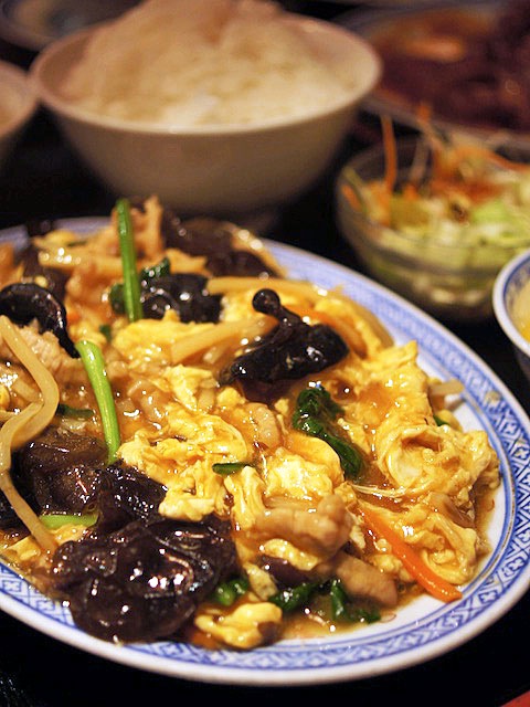 キクラゲと豚肉の卵とじがメインになった夜の定食。