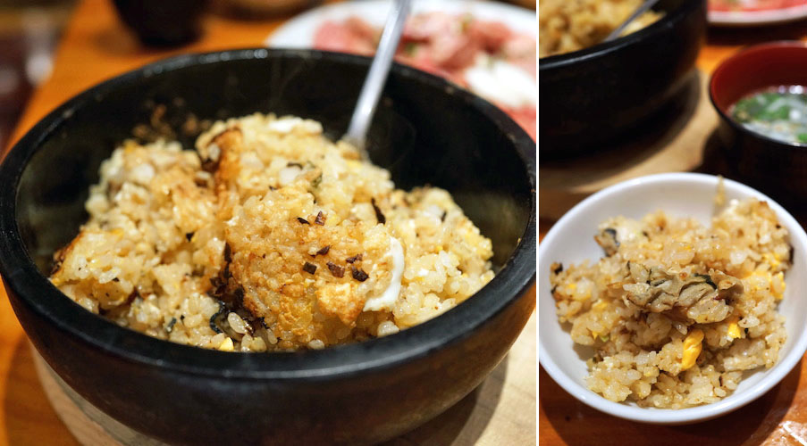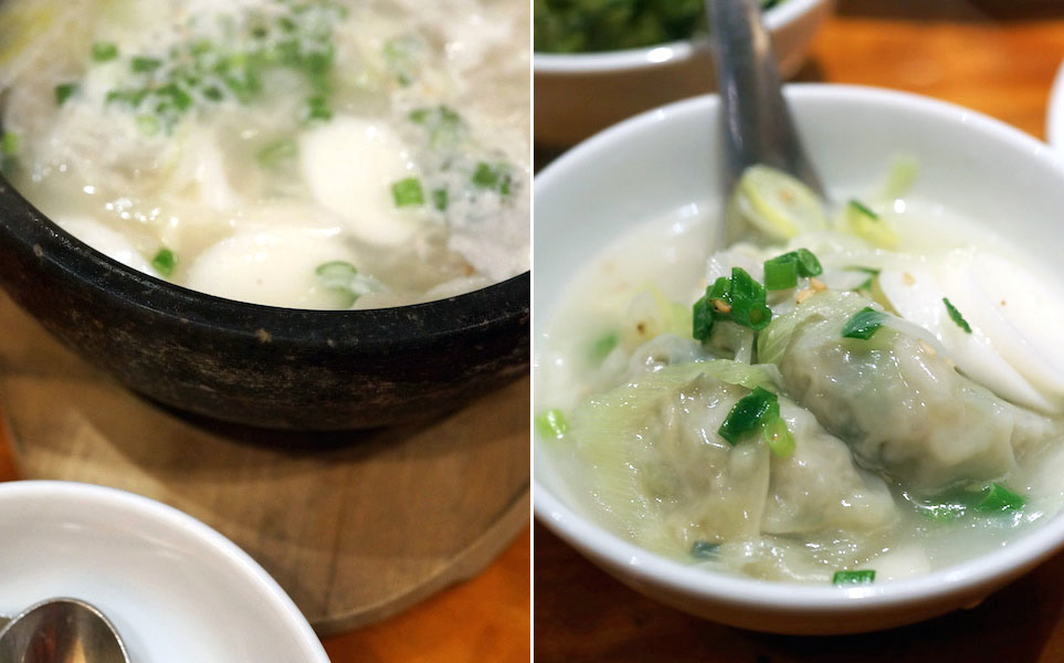 牛骨スープでトックとネギをコトコト煮込み、そこに餃子を沈めたモノ。石鍋の中でグツグツ、沸騰しながらやってくるのがなによりおいしげで、牛骨スープの匂いに混じって餃子の中のニラやニンニクの臭いが強烈。