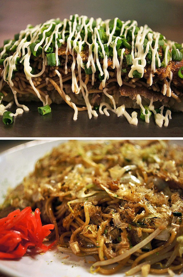 割ってほぐして軽くやきそこにお好み焼きをおいて、両方ピタッとくっついたらばひっくり返しソースを塗ります。