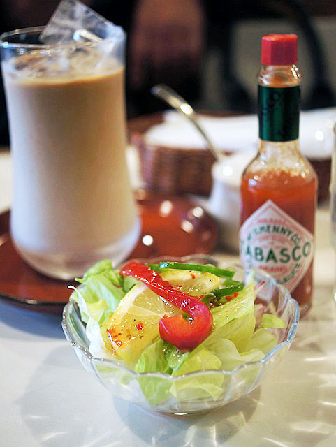 二人でそれぞれのお昼メニューをわけあって、サラダにアイスカフェラテ飲んで味わう。