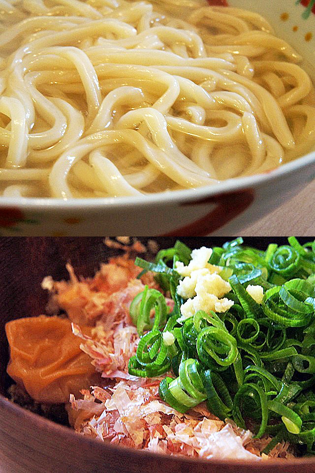 うどんをトプッと椀に入れ、ネギや鰹節と一緒に巻き取り口に運ぶと、麺のモッチリした食感がネギの歯ざわりで引き立って食べててたのしい。