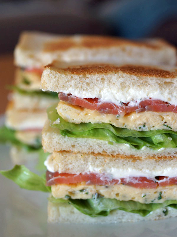 レタスに、ディルをくわえてふっくら焼いた玉子を重ね、一番上にスモークサーモン。クリームチーズを塗ったパンで蓋してざっくり、2つに切ってできあがり。