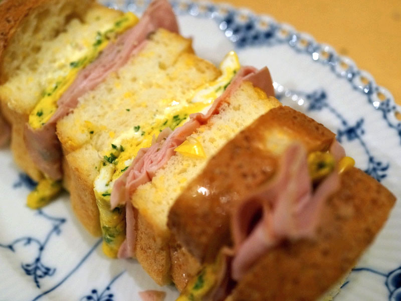 そのザックリとした食感を活かすために、パセリをタップリくわえてふっくら焼いた玉子と、シュゼットハム。ほんの少しのマヨネーズで風味をつけて切る。