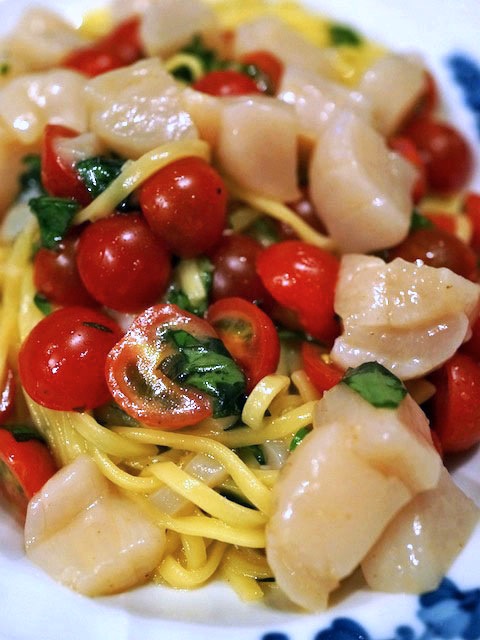 タリアッテレを長めに茹でて氷水でキリッとしめる。小さなトマトを2つに切ってピーナツオイルと刻んだバジルと一緒に漬けて、味と香りをうつしたところにイカの塩辛で旨みをつけて、グイグイ、パスタに揉み込んでお皿にうつしてレモンの酸味で〆たホタテをコロコロ飾る。