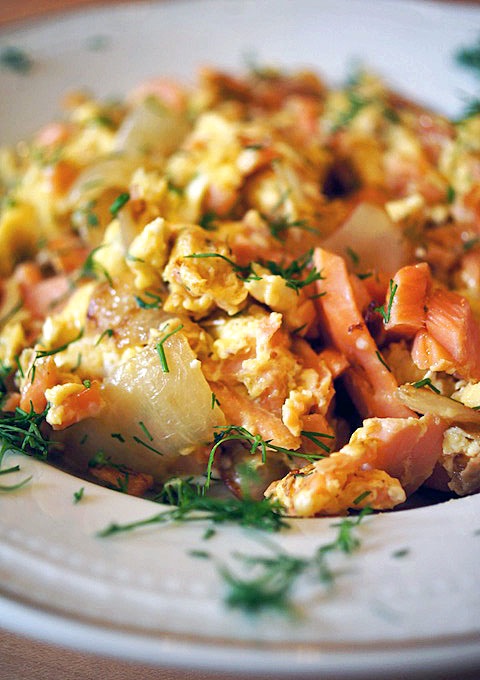 ディルをきざんで一緒に混ぜて、鍋に入れたらユックリ、ユックリ、混ぜながらスクランブルエッグに仕上げてお皿に盛り付ける。
