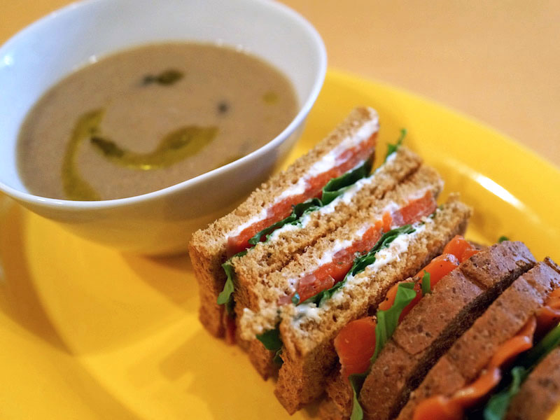 一緒にマッシュルームのスープをあっため、サンドイッチのお供に食べる。お腹もたのしくあったまる。