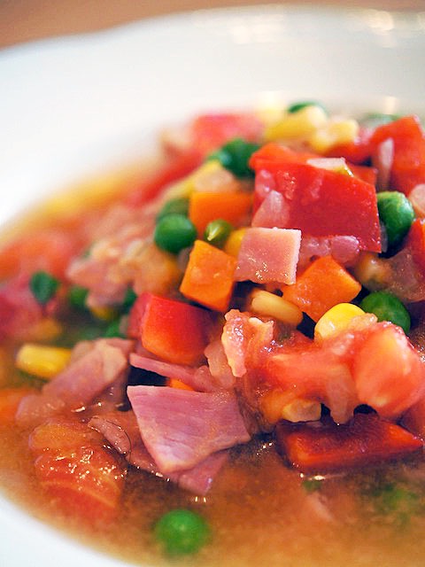 崩れたトマトや豆やパプリカの皮が舌の上に残って、食感ちょっと騒がしいレストランでは作らぬ雑な仕上がりが、むしろ野菜を食べてるみたいな気持ちになって、目が覚める。