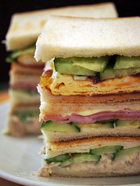 本当は、全部を一つに重ね合わせて分厚く作ろうって思いもしたけど、存在感がそれぞれ異なる具材同士がケンカするような気がしてそれで、三種類の別々サンドにすることにした次第。
