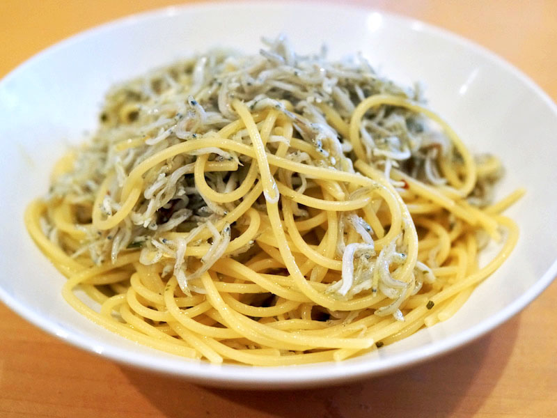 ニンニクと赤唐辛子をオリーブオイルで軽く炒めて、そこにちりめんを入れて炒める。香りがでてきたところでパスタをうつしてチャチャッ。