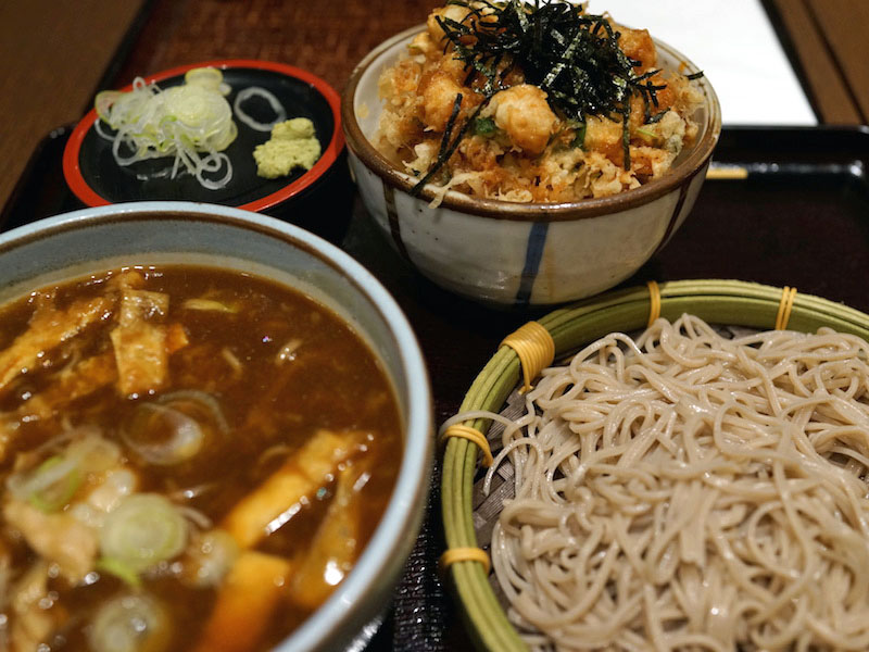 カレー南蛮の中にはネギ、豚肉、それから油揚げ。それそのもので充分おいしく、けれどそこにかき揚げ丼のかき揚げ部分をのっけて食べると、揚げた油のコクに風味、揚がった直後に浸した丼タレの甘辛味がカレーに溶けておいしさ倍増。