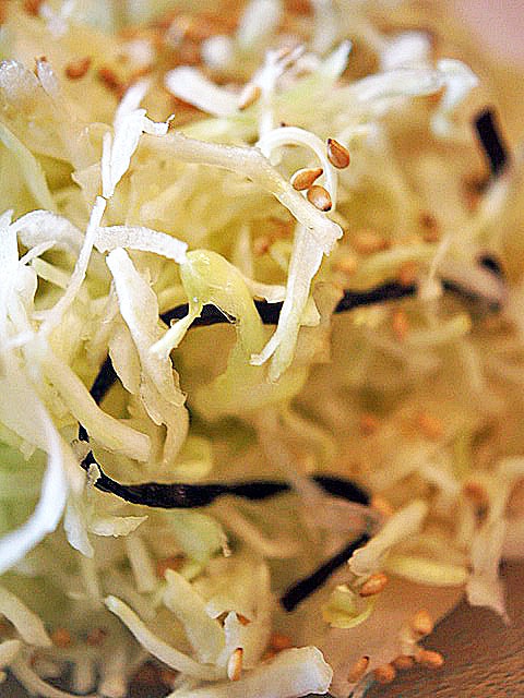 昆布のうま味と塩の味…、それがキャベツの中に入って、ちょっとしんなり葉っぱが縮んで色もほんのり昆布の色がうつって来ます。