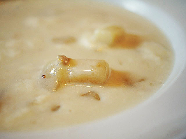 チャウダースープの表面に、ミルクの泡が固まってフワフワ浮かぶ。