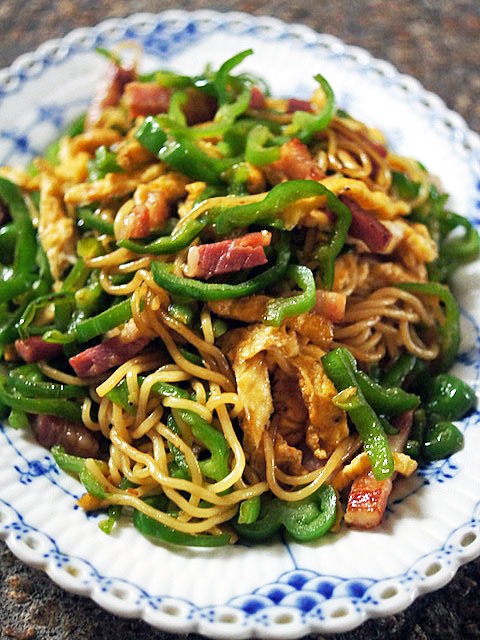 麺はシットリ、なめらかでシャキシャキ、ほどよく焼けたピーマンの食感、それから緑の香りが軽くてたのしい。