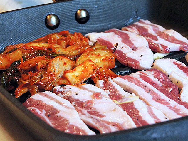 豚肉を片面焼いたら、キムチを肉の上に移して、それで肉を包み込むように焼き上げていく。