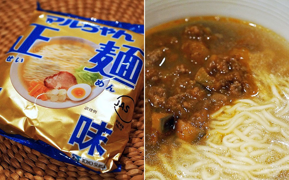 多めのお湯にスープを入れて煮立てて味をちょっとみて、塩と胡椒でエッジをきかせる…、そこに乾麺、固めに仕上げて丼へ。残ったカレーを電子レンジであたためて麺の上にそっとのっけて出来上がり。