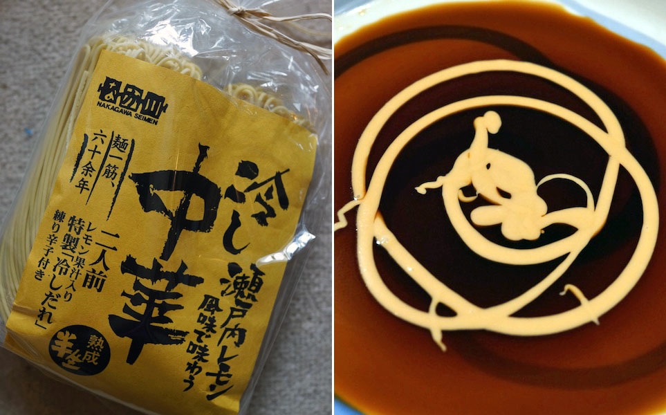 麺は広島の製麺所が作った冷やし中華用の細麺で、タレは付属のレモンダレ。