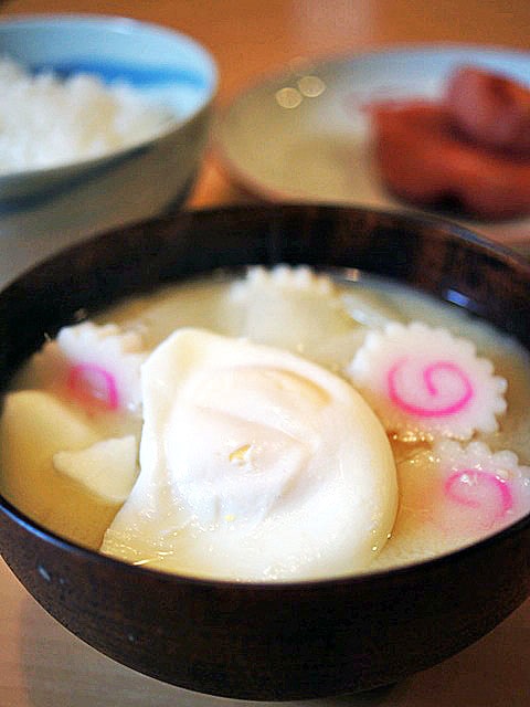 なるとをいれて、一旦沸騰させたらそこに出汁で溶いた味噌を入れ、いち、にぃ、さん、しと数えて火を止め出来上がり。