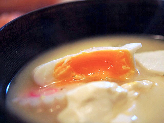 大根入りの出汁を温め、そこにポーチドエッグを入れる。