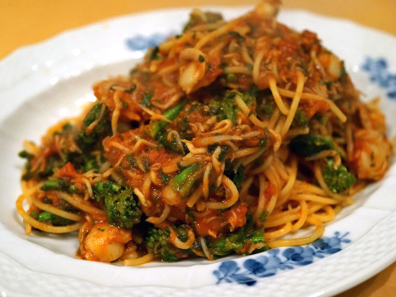 今日はトマトソースと煮込む。ルッコラとバジルを刻んでタップリ入れて、それと一緒に小さなホタテ。クツクツ煮込んで、固めに茹でたパスタとあわせる。