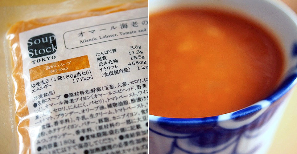 スープストックで売ってたビスクの冷凍レトルト…、お鍋にお湯を沸かしたところに沈めて5分。