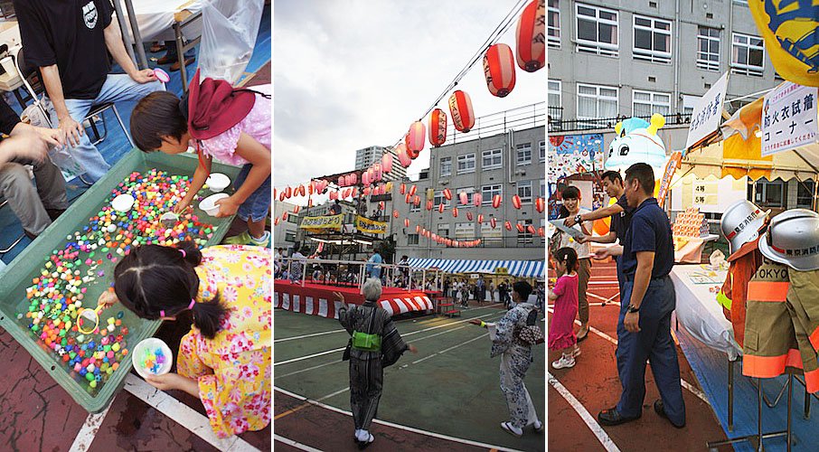 金魚すくいや鉄砲打ちの屋台に子供が集まって、焼きそば屋台に長蛇の行列。