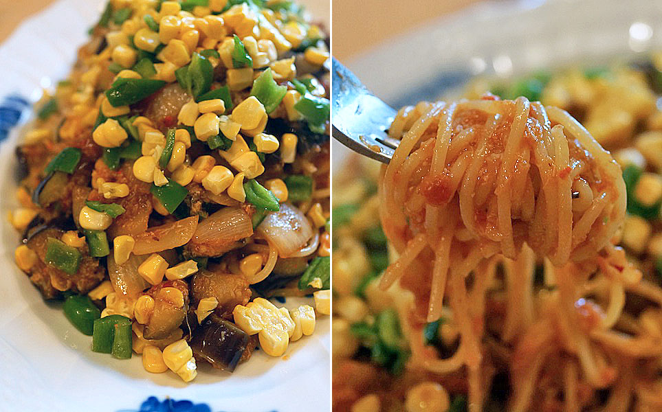 茄子がトロンとなめらかに、レアに仕上げたとうもろこしのシャキシャキとした食感と青い香りのピーマンが夏のパスタのようにふるまう。