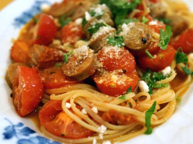 別の鍋で焼いといたソーセージと、甘くて最近気に入っている、皮の薄めのトマトを炒め、全てを合わせてタプンタプンと揺する。