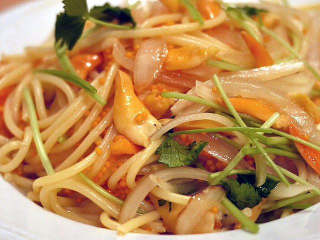 トビッコのプチプチはじける食感に、ツルンと口を逃げ回るよなパスタの歯ごたえがにぎやかで良い。