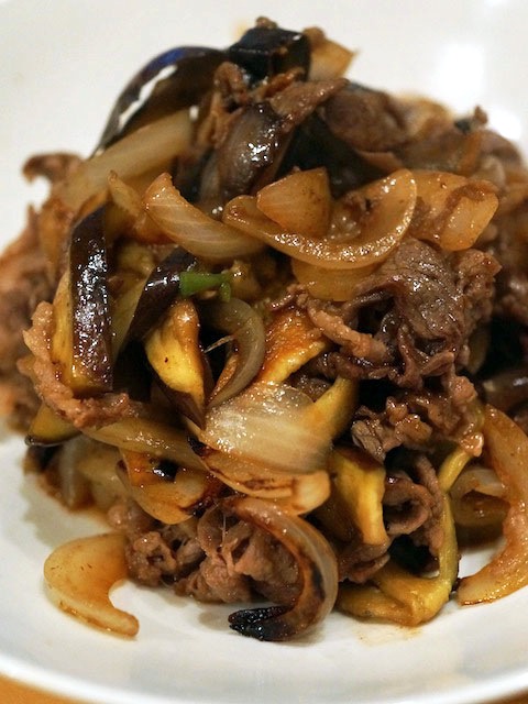 一緒に玉ねぎ、それから茄子を細切りにして電子レンジであたためたのを強く搾ってくわえてジャジャっと。