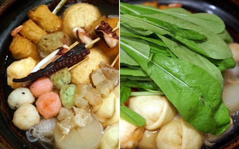 タコに牛すじ、魚河岸揚げにいわしのつみれ。白赤緑に色鮮やかなフィッシュボールは目に楽しくて、ゴボウや小エビ、イカゲソなどを芯にした、一口大の小さなさつまあげなどあれこれ。