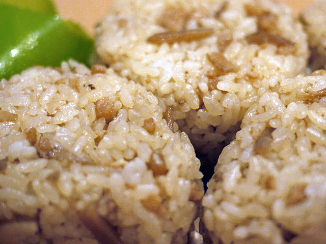 博多のうどん屋さんに行くと、必ず置いてあるのがかしわご飯の握り飯。