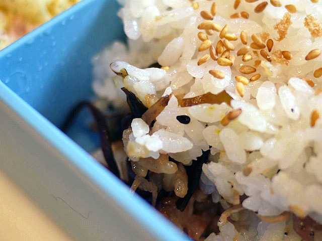 薄ぅく詰めたご飯の上に、昆布の佃煮。