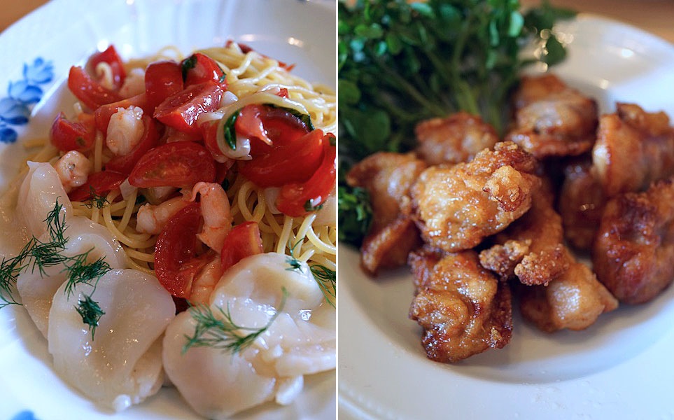 大きなお皿に盛り込んで、サイドにサラダを添えて食べるとサラダもパスタの具材のようになってくるのがオモシロく、熱々ジュワジュワの唐揚げも一層おいしく感じます。