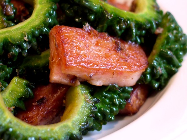 それで半分、揚げるように火を通し油にランチョンミートの香りと塩味を移しておいて、そこにゴーヤを放り込む。