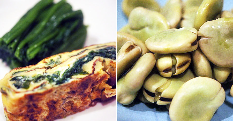 瀬戸内海の若い海苔…、あおさを乾かし板状にしたモノをクルンと巻いて芯にした出汁巻き玉子に、茹でて絞ったほうれん草。
