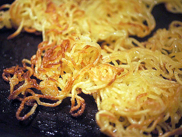 それをフライパンに多めに沸かした油の中に、バサッといれて揚げ焼きにする。