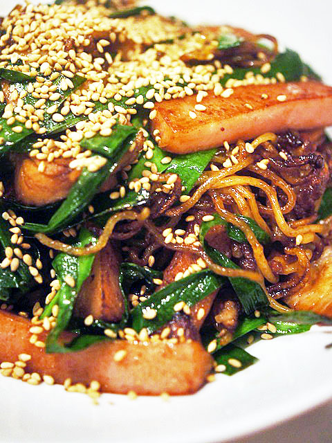 鍋を動かし、ちゃちゃっと鍋肌をニラがキスするようにして、チュンチュン焼いてそこに粉末ソースを半分だけ。