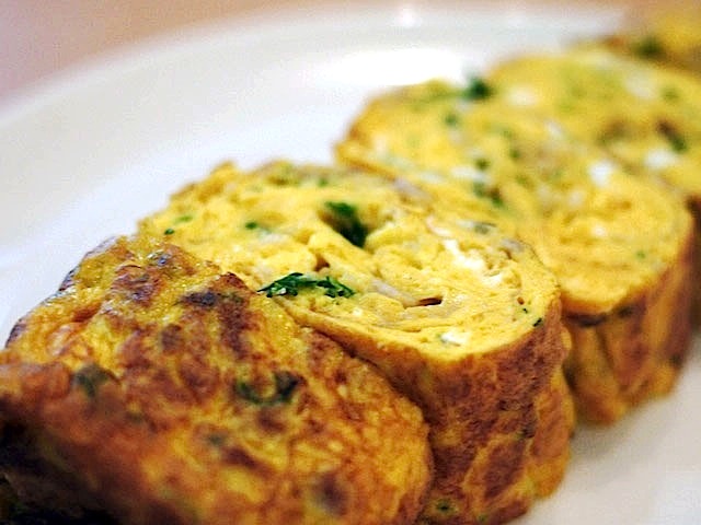 全部で5回ほどですか…、流して巻いてをくりかえしそれでコンガリ、出汁巻き玉子が出来上がる。