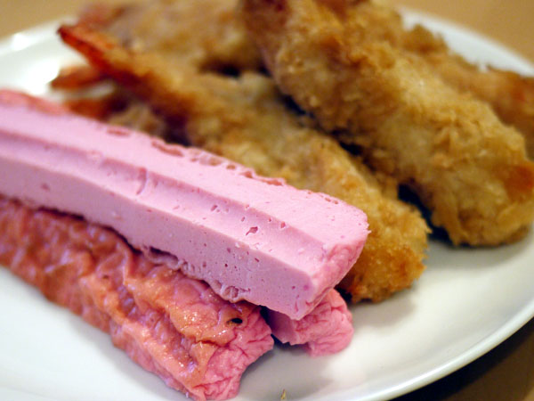 エビの竹輪は讃岐独特の特産品で、エビを殻ごとすりつぶし豆腐と一緒に混ぜ合わせそれを竹輪状にして焼き上げる。