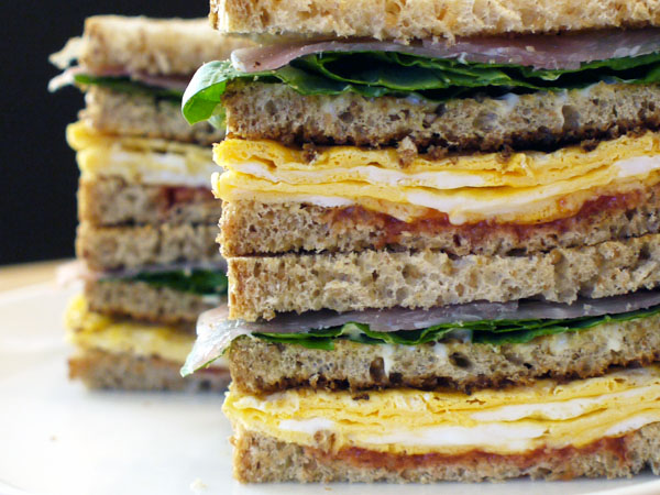 トースト+(薄焼き玉子×ケチャップ)+よく焼きトースト+(マヨネーズ+スイートバジル+生ハム)+トースト。