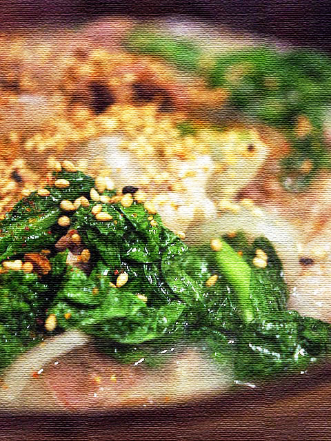 そして最後に菜花を投入、緑の色がサッと明るく鮮やか色に変わったところで、お椀に移して胡麻をパラリで出来上がり。
