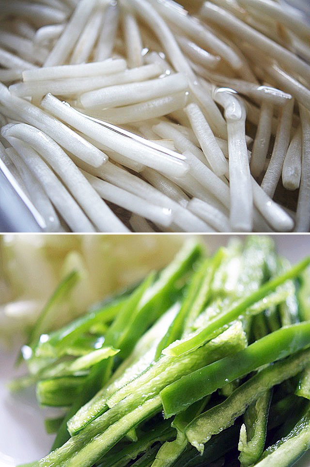 それからピーマンを同じように細切りにして、セロリの根っこを薄切りにする。
