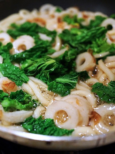 うどんに出汁が染みこんで、色が明るい飴色になってきたらば菜の花を入れ、蓋して火を止め休ませる。
