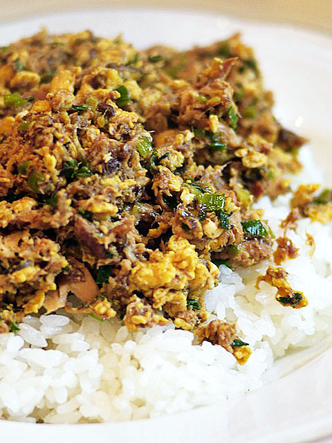ほんの少しのカレー粉を足し、風味をつけて熱々ご飯の上にのっける。