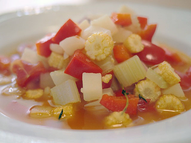 今日のはキャベツ、ダイコン、コーンが主体のお子さまコンソメです。