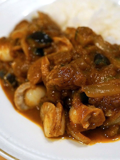 串切り玉ねぎにダイスカットにした茄子を油で軽く炒めてカレーのペーストくわえて水を足す。