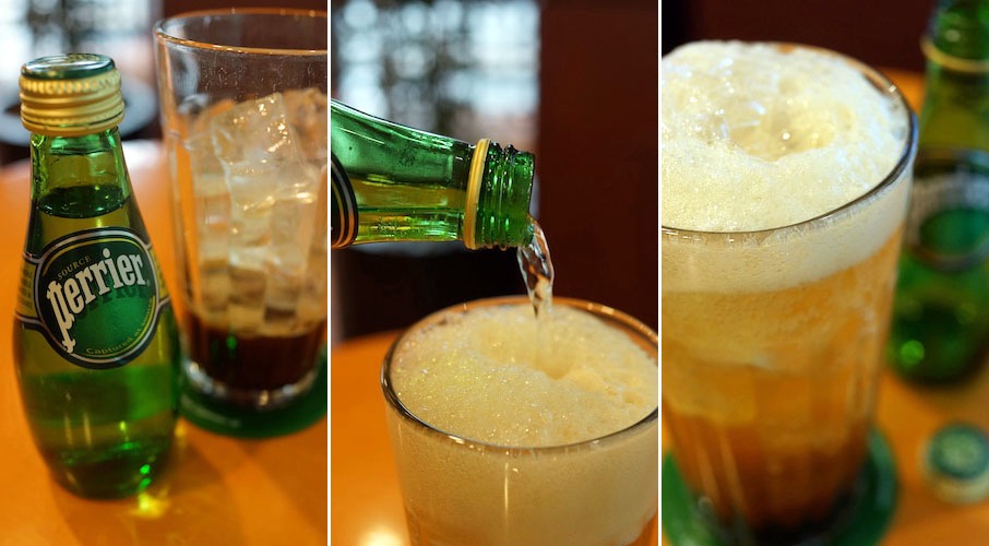 甘みをくわえたエスプレッソが含んだコーヒーの豆の粒つぶ、それとペリエの泡が出会って、かなりたっぷり。